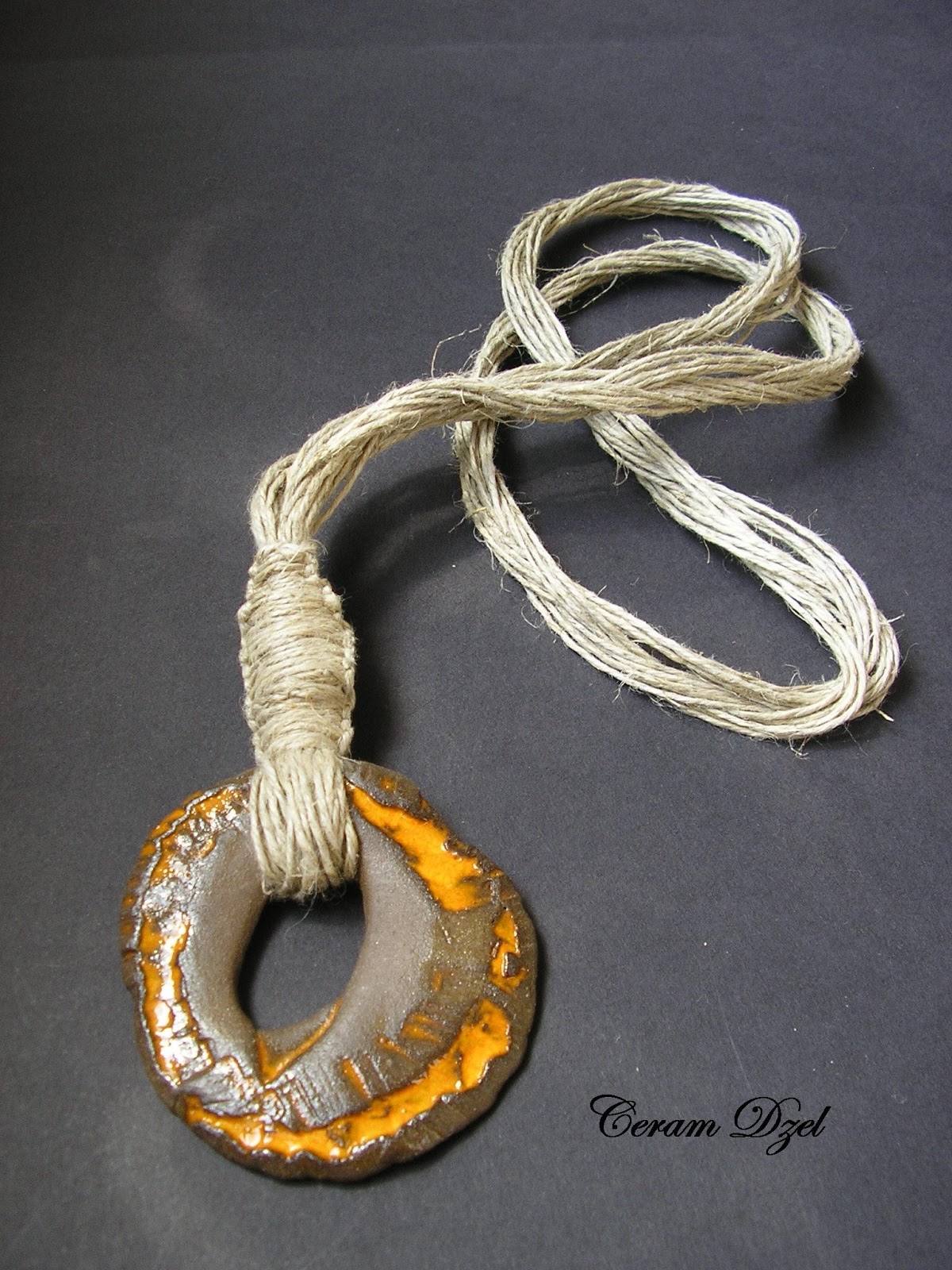 Sznurek (juta) + własnoręcznie stworzony ceramiczny wisior,(ceramika wypalana 2 razy, szkliwiona); Całkowita długość naszyjnika 44cm; szerokość wisiora ok 5cm.